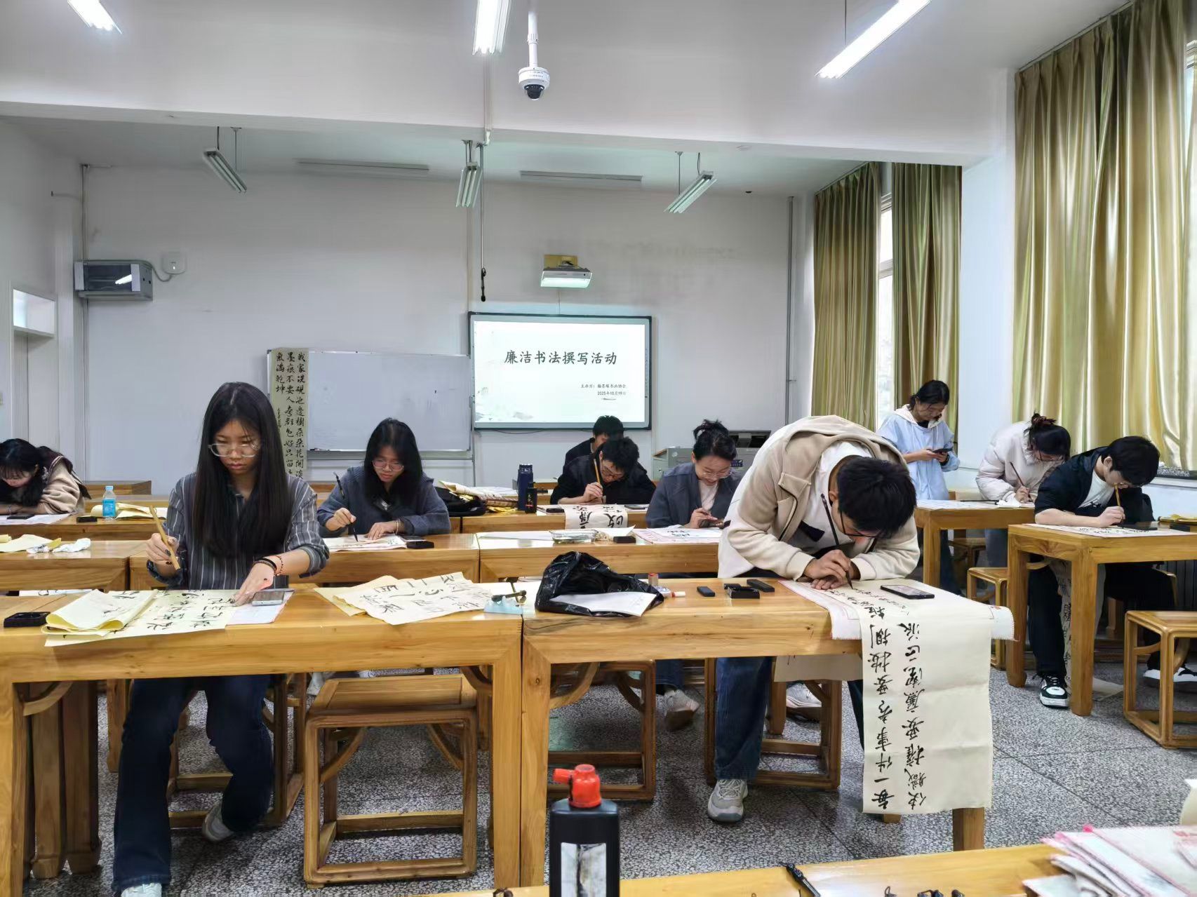 10月19日,“翰墨传廉韵·笔墨扬清风”廉洁主题书法活动于6号楼B206教室举办。墨香氤氲,廉意盈室,近30位书法爱好者齐聚一堂,以笔为剑、以墨为锋,共书清风正气,同绘廉洁新篇。活动现场,同学们围绕“廉洁与书法”相关内容即兴创作,将清风正气融入笔墨创作。收集的50余幅成品中,既有经典警句,也有原创廉政短句,每...