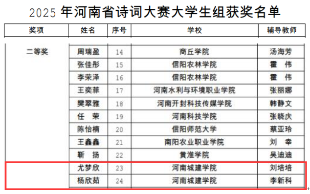 近日,河南省教育厅发布“2025年河南省诗词大赛获奖名单”(教社语〔2025〕262号),我校学子表现优异,荣获大学生组个人赛二等奖2项、团体赛三等奖1项。