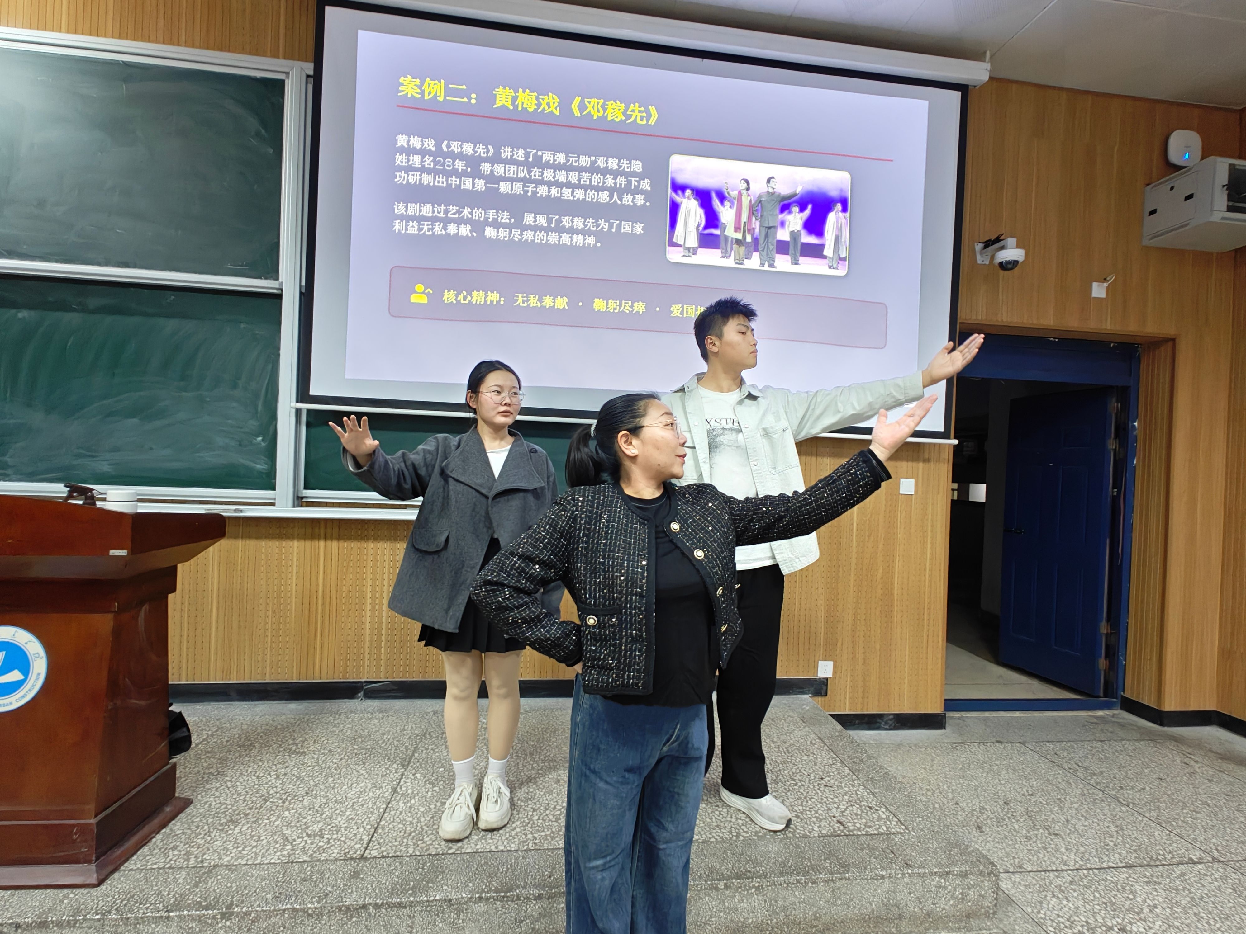 戏曲鉴赏课中,老师以黄梅戏《江姐》《邓稼先》等经典唱段为例,讲解戏曲如何塑造英雄形象。学生被邓稼先无私奉献、鞠躬尽瘁的精神和江姐坚贞不屈的爱国情怀深深打动。互动环节,学生纷纷模仿戏曲身段与手势,在一招一式中感受英雄气概。
